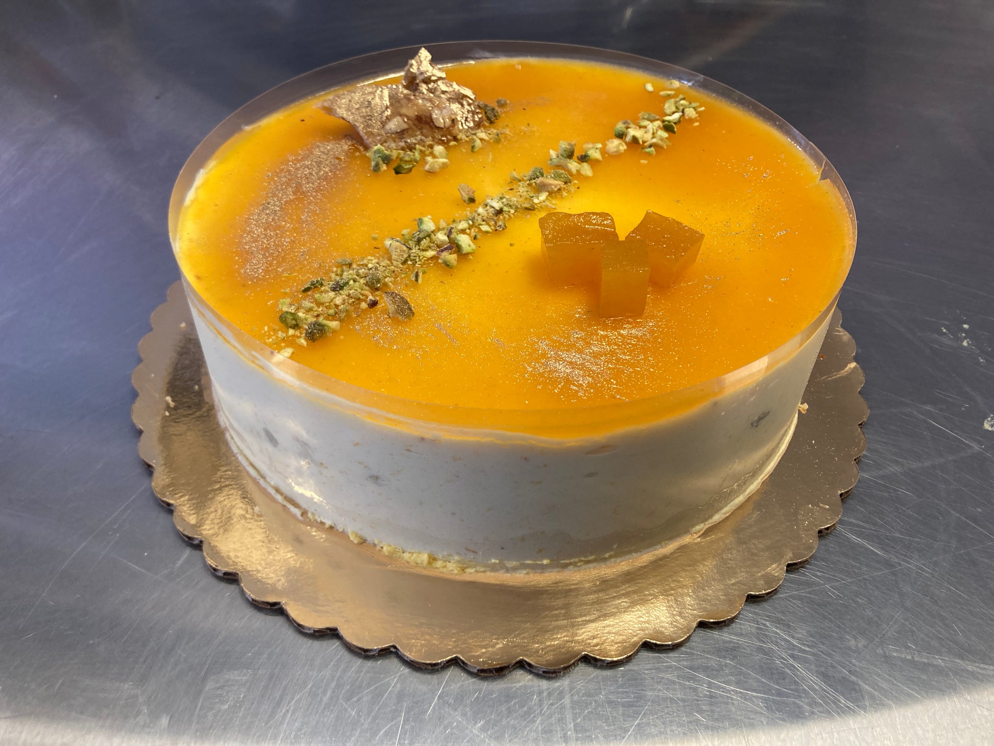 An exquisite mango and passion fruit mousse cake, with an insert of crunchy praliné ( candied hazelnuts crushed into a paste) and topped with a pure passion fruit purée jelly.